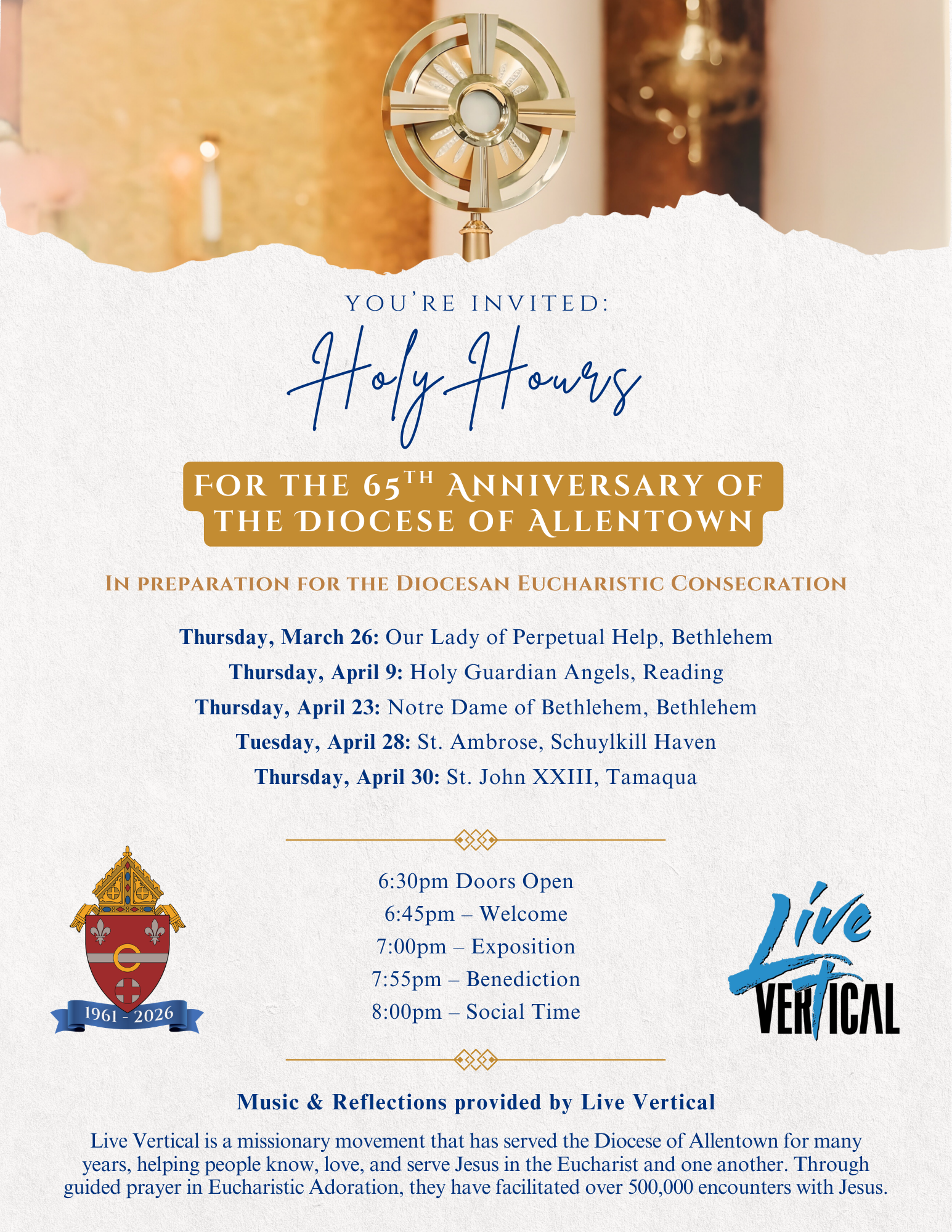 Join parishes across the Diocese of Allentown for Eucharistic Glory Holy Hours in celebration of the 65th Anniversary of the Diocese. These evenings of Eucharistic Adoration invite the faithful to gather in prayer, reflection, and community, with music and reflections provided by Live Vertical.