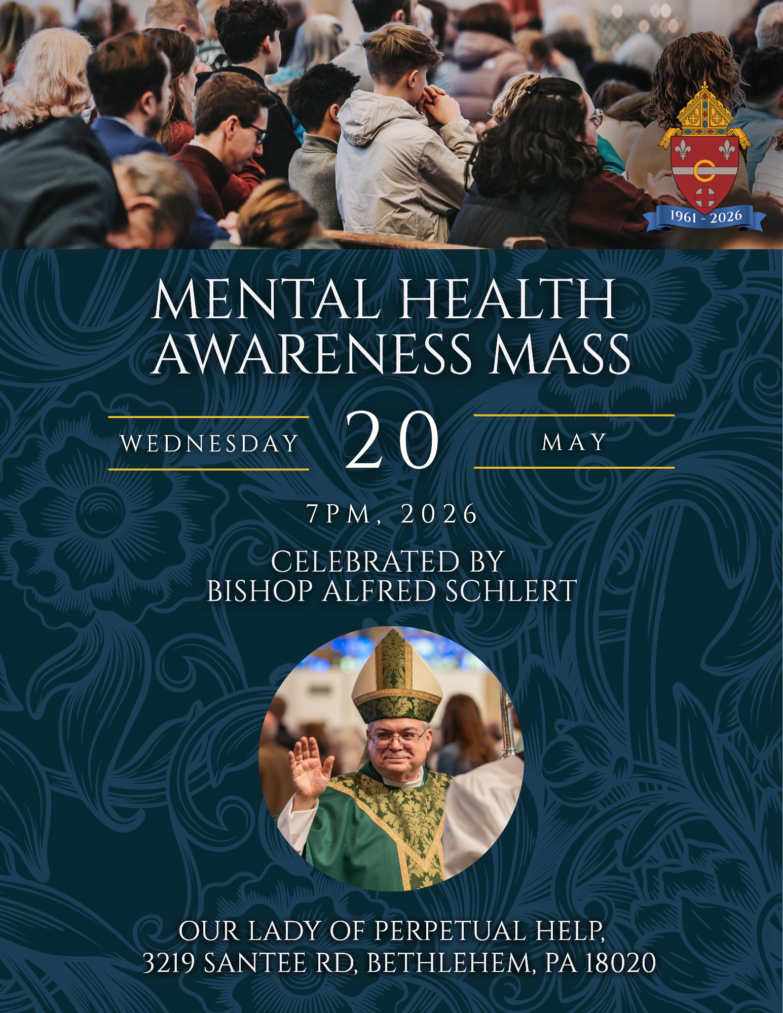 The Diocese of Allentown will host a Mental Health Awareness Mass on Wednesday, May 20, 2026, at 7:00 p.m. at Our Lady of Perpetual Help, Bethlehem. Celebrated by Bishop Alfred Schlert, this Mass will offer an opportunity for prayer, reflection, and support for those experiencing mental health challenges, as well as for