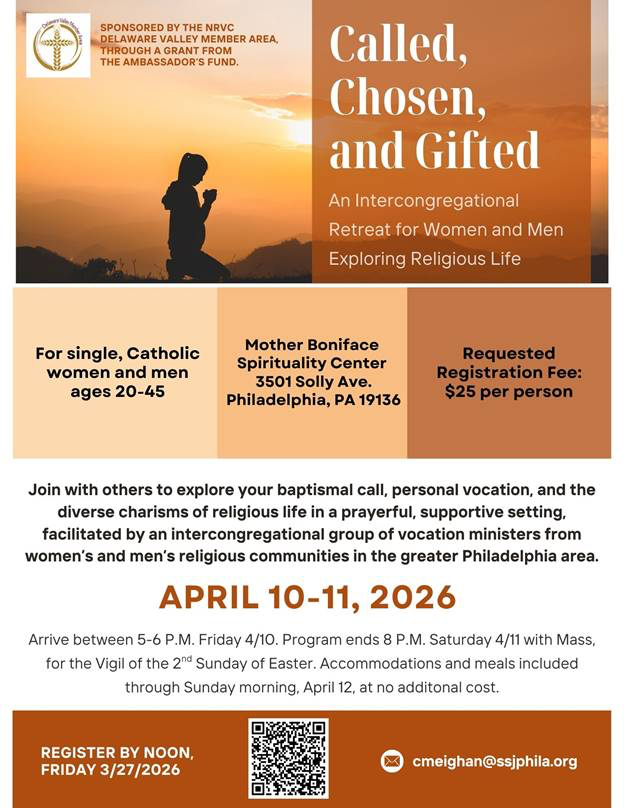 On April 10-11, 2026, the NRVC Delaware Valley Member Area is sponsoring a Discernment Retreat, “Called, Chosen and Gifted.” This retreat is an Inter-congregational retreat for men and women, ages 20-45 who are exploring religious life. The retreat will be held at the Mother Boniface Spirituality Center in northeast Philadelphia, PA with an option to stay an additional night for quiet reflection if interested.